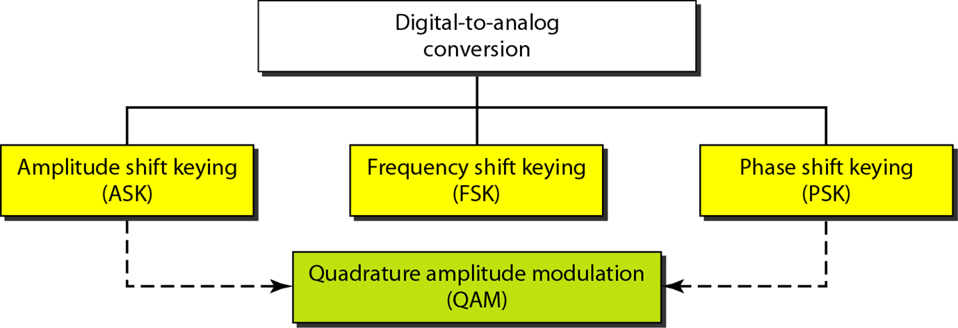 - 디지털-대-아날로그 변환: 디지털 데이터를 저대역 통과 아날로그 신호로 변환