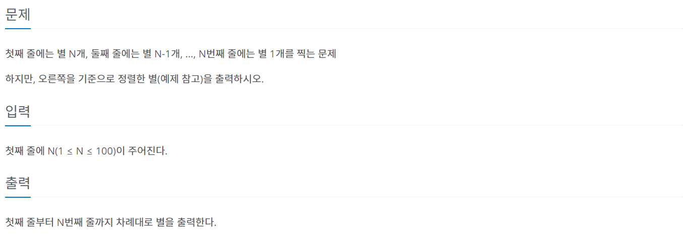 첫째 줄에는 별 N개, 둘째 줄에는 별 N-1개, ..., N번째 줄에는 별 1개를 찍는 문제 하지만, 오른쪽을 기준으로 정렬한 별(예제 참고)을 출력하시오.