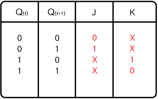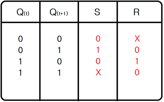 - 플립플롭에서 현재 상태(Q(t))와 다음 상태(Q(t+1))를 알 때, 플립플롭에 어떤 입력을 넣어야 하는가를 표로 만든 것이다.
