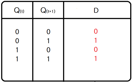 - 입력과 다음 상태 사이의 관계는 Q(t+1) = D로 나타낼 수 있다.