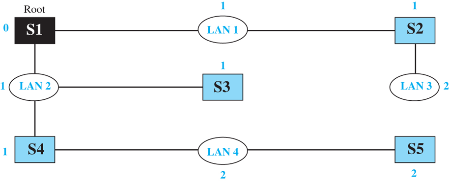 3) 스위치로 연결된 LAN에서 스패닝 트리는 각 LAN에서 어느 다른 LAN에 루프없이 도달할 수 있는 단지 하나의 경로만 있는 접속형태