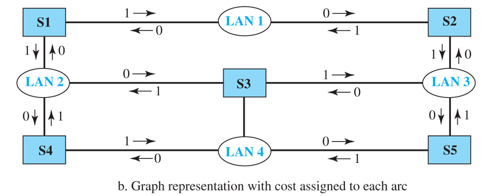 4) 원래는 LAN과 스위치를 연결하는 각 호에 대한 비용을 할당해서 최소 비용으로 알고리즘을 수행해야 하지만 여기서는 최소 홉 수를 사용