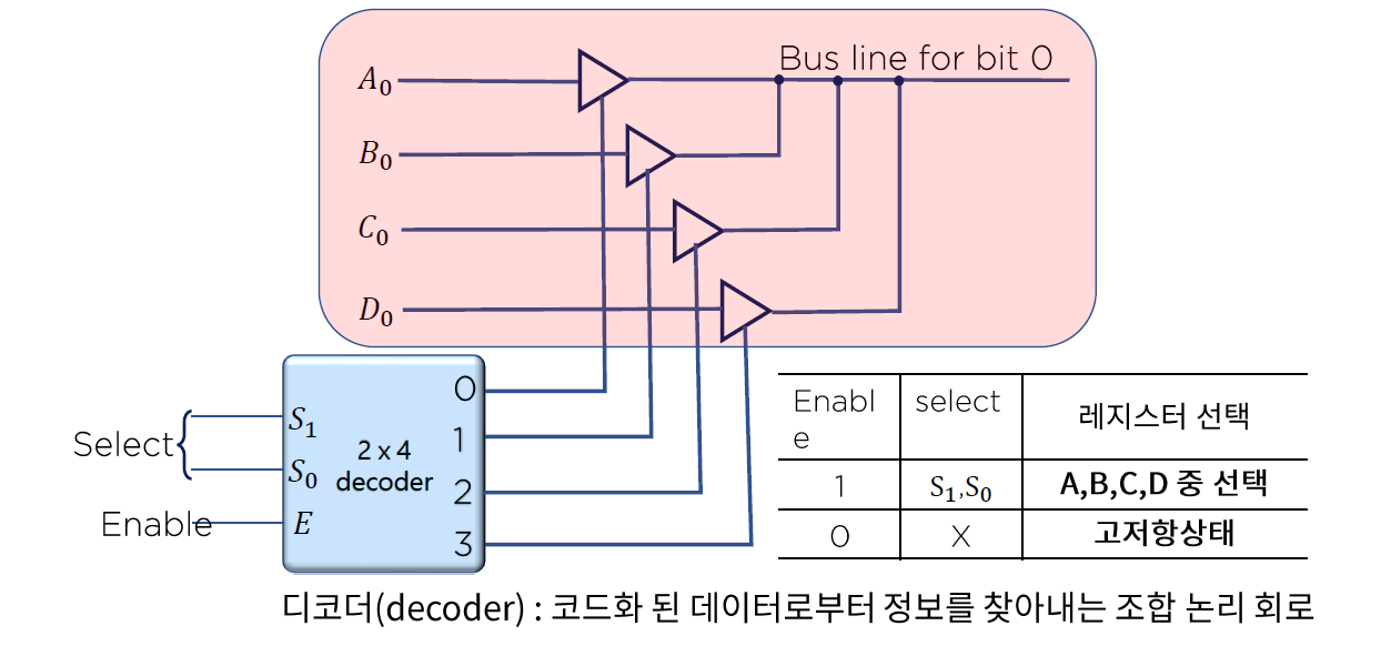 4-3) 디코더를 이용하여 한 순간에 오직 하나의 3-상태 버퍼만이 활성화 되어 버스에 연결된다.