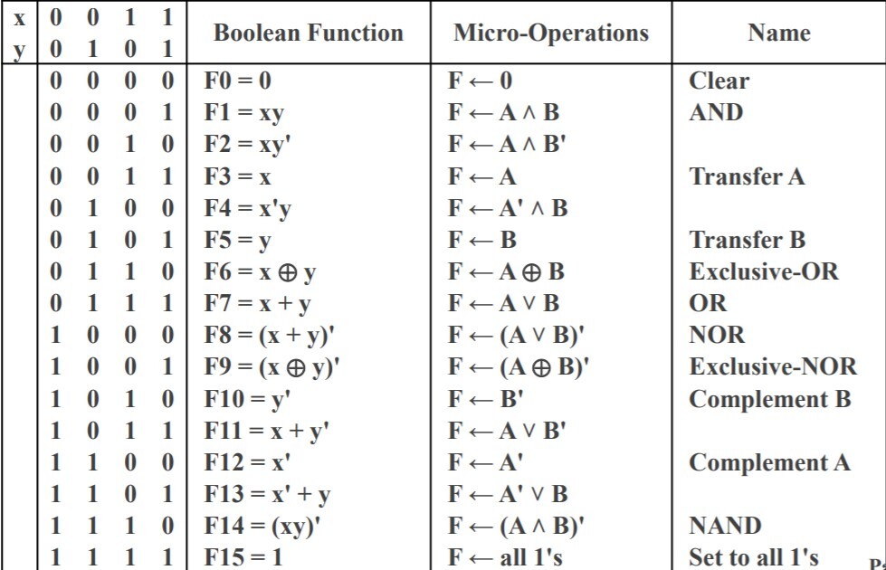 2) 부울 대수에 있어서 OR, AND, 보수 연산과 구별하기 위하여 논리 마이크로 연산에서는 OR를 V로, AND를 ^로 표시한다.