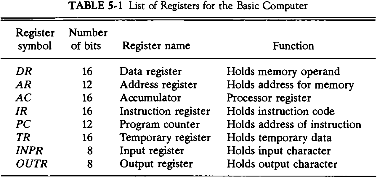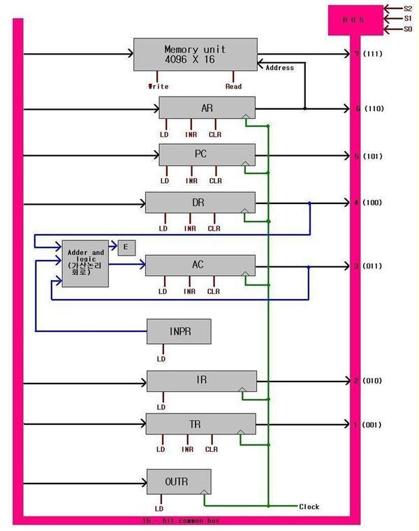 5) 메모리 주소 레지스터(AR), 프로그램 카운터(PC): 메모리의 주소를 나타내어야 하므로 12비트로 구성되어 있다.