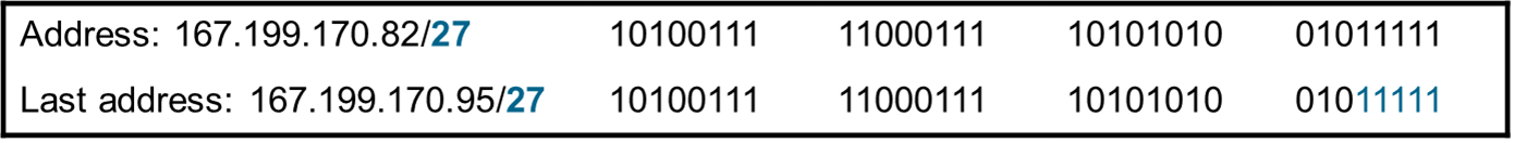 예시) 167.199.170.82/27이 클래스 없는 주소로 주어졌다. 위에서 언급한 세 가지 정보를 아래와 같이 찾을 수 있다.