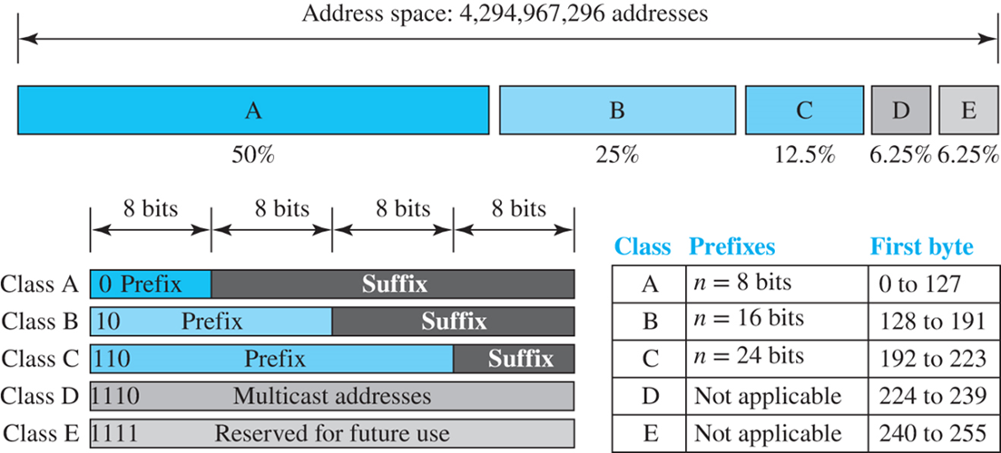 2) 전체 주소 공간은 5개의 클래스(A, B, C, D, E)로 구분된다.
