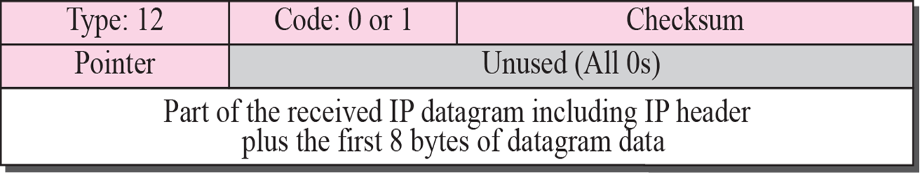 1) 데이터그램의 헤더에 문제가 있거나(코드 0) 어떤 옵션이 없거나 옵션의 의미를 알 수 없는 경우(코드 1)에 전송