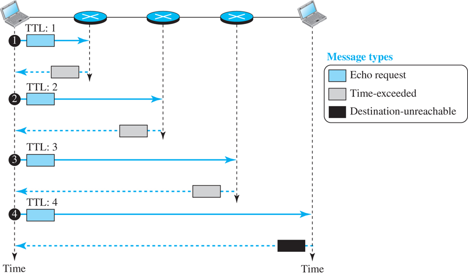 3) 일부러 목적지에서 사용하지 않는 포트 번호를 사용. 만약 n개의 라우터가 경로상에 있다면 traceroute 프로그램은 (n+1)개의 메시지를 전달. 첫번째 n 메시지는 각 라우터에서 하나씩 n개의 라우터에 의해 폐기되고, 마지막 메시지는 목적지 호스트에서 폐기됨
