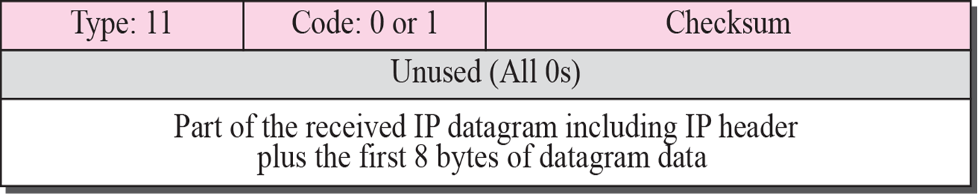 1) TTL 값이 0이 되면 데이터그램은 방문한 라우터에 의해 폐기되며, 코드 0을 사용하는 시간 경과 메시지를 발신지에게 전송한다.
