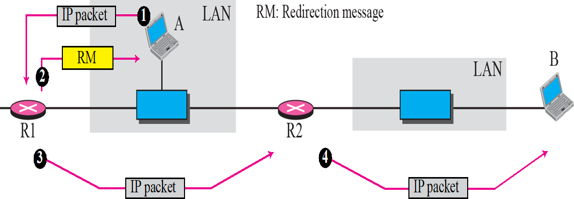 2) 아래 그림에서 라우터 1은 적절한 라우터2에게 메시지를 전달하도록 재지정되지만 라우터 1은 발신자에게 향후 디폴트 라우터2로 변경해야 함을 통보한다.