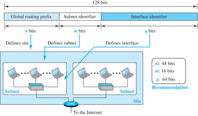 3) 이 블록의 주소는 그림과 같이 글로벌 라우팅 접두사(n비트), 서브넷 식별자(m비트),인터페이스 식별자(q비트)로 구성된다.