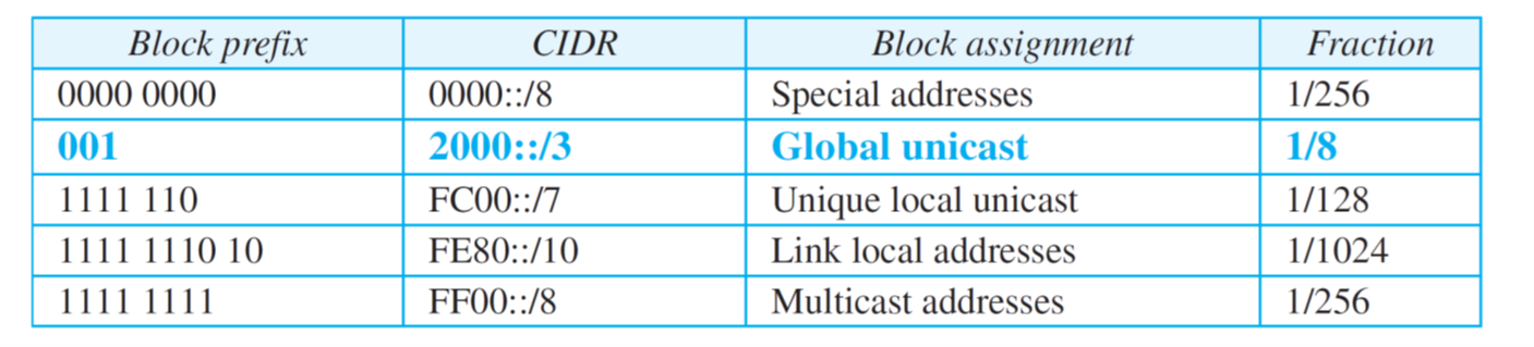 1) IPv4의 주소 공간과 같이 IPv6 주소 공간은 다양한 크기의 여러 공간으로 나누며, 각 블록은 특수한 목적에 사용된다.