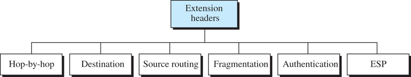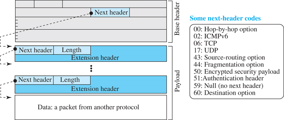 2) IP 데이터그램에 더 큰 기능을 제공하기 위해 기본 헤더 뒤에 6개까지 확장 헤더들을 둘 수 있음